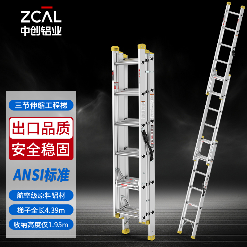 中创梯子单面伸缩梯三节梯4米直..